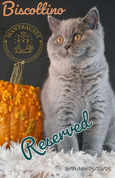 Biscottino is an absolutely adorable blue British Shorthair male with exceptional coat quality and the sweetest personality. His name means "little cookie" in Italian, perfectly capturing his delightful nature. Biscottino's classic blue-gray coat is incredibly dense and plush, with the texture that makes British Shorthairs so irresistible to touch.