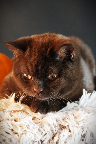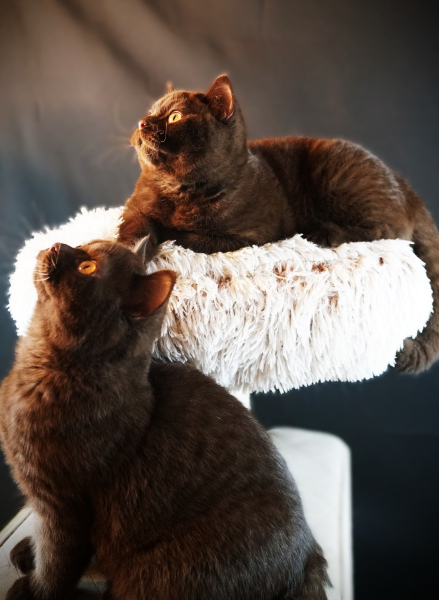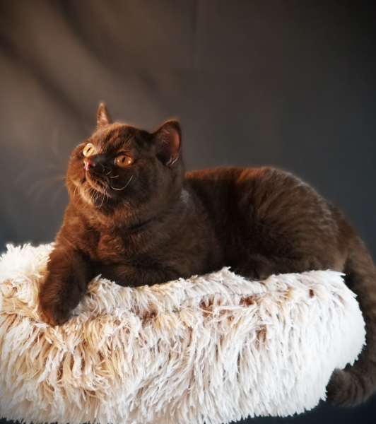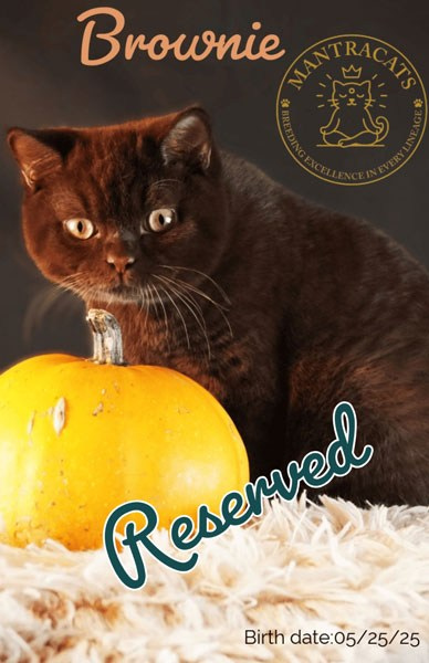 Brownie is a warm, rich chocolate British Shorthair male with a personality as delightful as a fresh-baked treat. His solid chocolate coat is deep and even, showcasing the rare brown coloring that makes chocolate British Shorthairs so special. Brownie's plush, dense fur and round, expressive face make him absolutely irresistible.